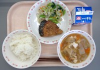 ごはん、魚の麦みそ焼き、だいこんサラダ、かきたま汁、みはや、牛乳