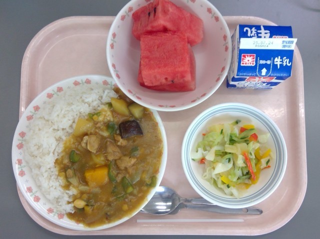 夏野菜とチキンのカレーライス、トロピカルサラダ、大玉すいか、牛乳