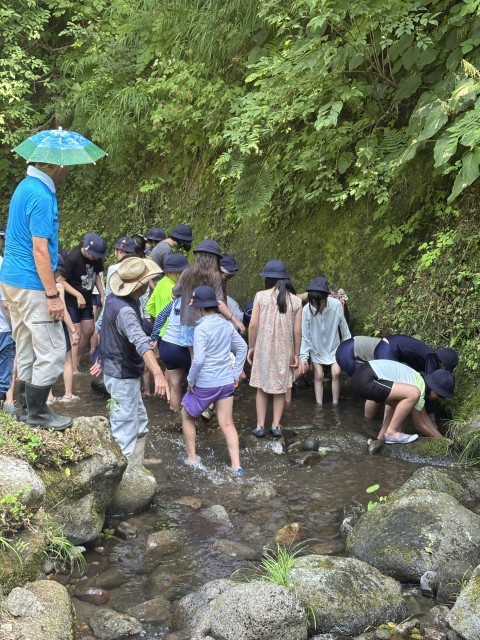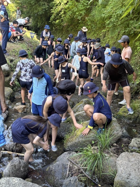 岩陰に隠れたマスを探し、手でつかまえました。川遊びでは、川の水の冷たさを楽しみました。