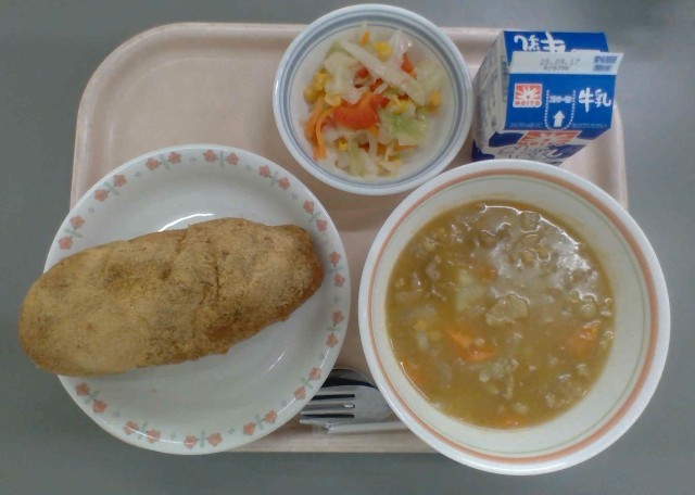 明日葉あげパン、カレーシチュー、キャベツとパプリカのサラダ、牛乳