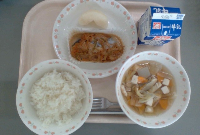 ごはん、魚のみそマヨネーズ焼き、けんちん汁、梨、牛乳