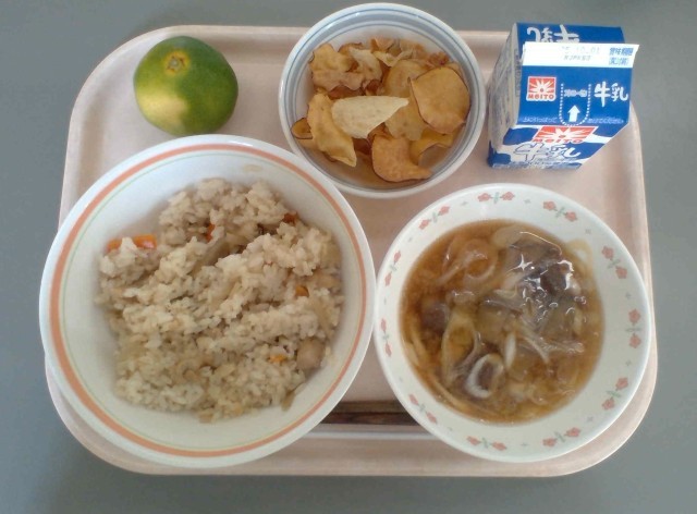 鶏ごぼうごはん、根菜チップス、なすと豆腐のみそ汁、みかん、牛乳