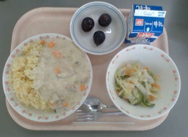 ドリア風、バジルドレッシングサラダ、ピオーネ、牛乳