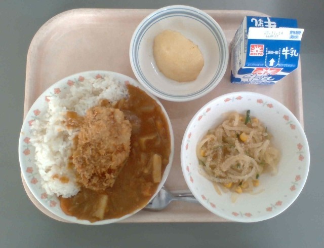 カツ(勝つ!)カレーライス、大根とコーンのサラダ、洋梨、牛乳