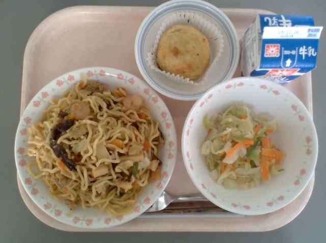 エスニック焼きそば、レモンソースサラダ、スイートポテト、牛乳