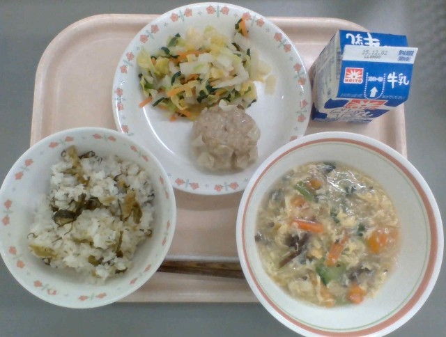 高菜ごはん、ジャンボしゅうまい、白菜の和え物、春雨スープ、牛乳
