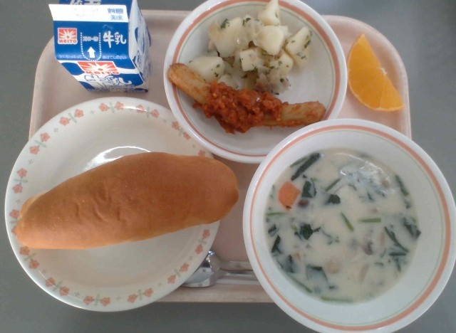 チーズパン、カリーブルスト、ジャーマンポテト、きのこのクリームスープ、紅まどんな、牛乳
