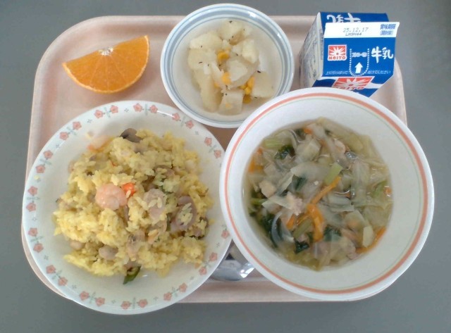 パエリア風混ぜごはん、バジルコーンポテト、ガーリックスープ、夢オレンジ、牛乳