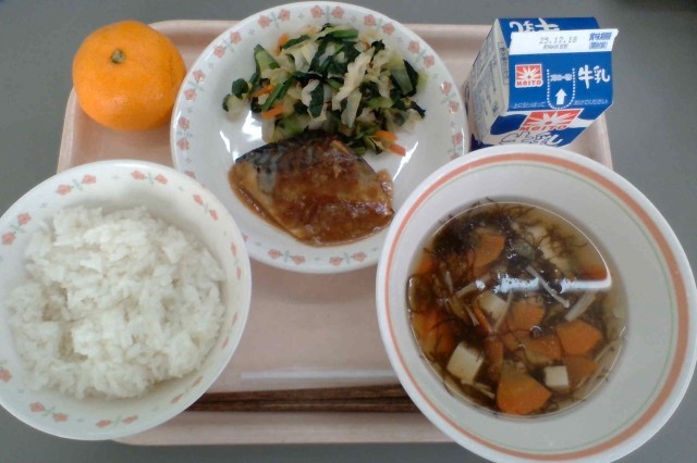 ごはん、さばのみそ煮、土佐和え、もずく汁、みかん、牛乳
