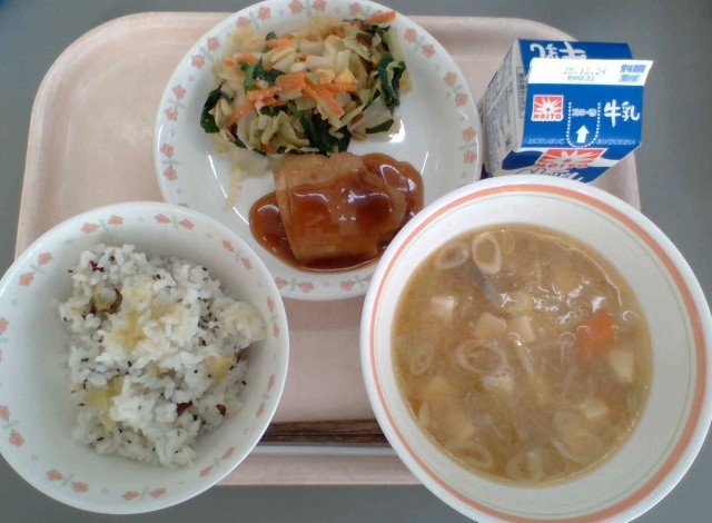 さつまいもごはん、鶏肉の照り焼き、キャベツの和え物、石狩汁、牛乳