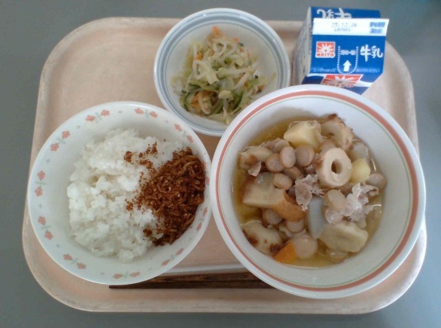 ごはん、カレーふりかけ、洋風おでん、みそドレサラダ、牛乳
