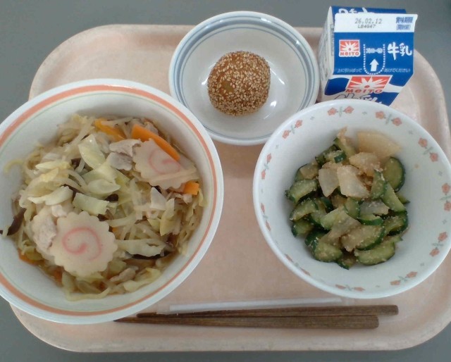博多ラーメン、ピリ辛きゅうり、ごま団子、牛乳