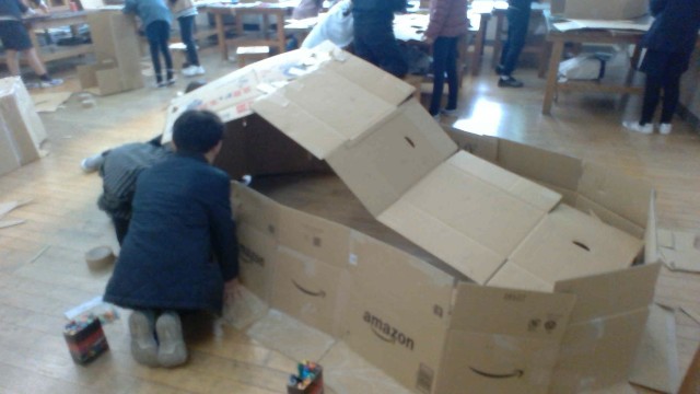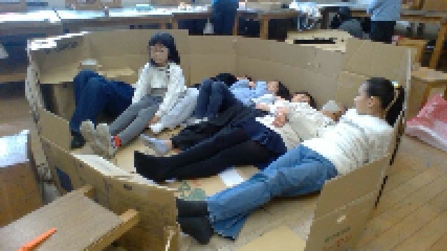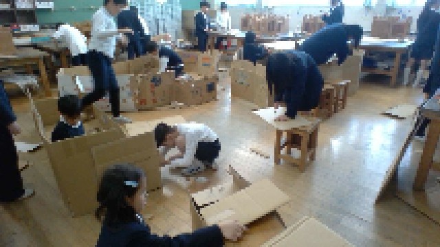 段ボールを加工して、いつもの図工室ではできないことを楽しみました。