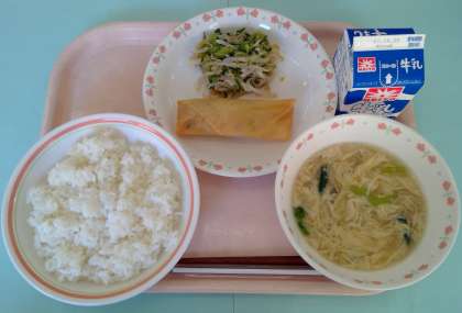 ごはん 春巻き きゅうりのじゃこ和え きのこの卵スープ 牛乳