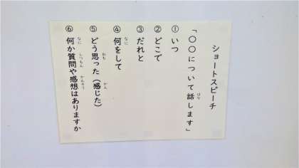 ふたばの個別指導や小集団指導で使用している「ショートスピーチ」の教材を紹介します。「いつ・どこで・だれが・どうした・どう思ったか」を順序だてて話す学習です。