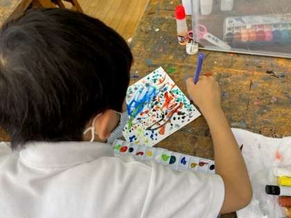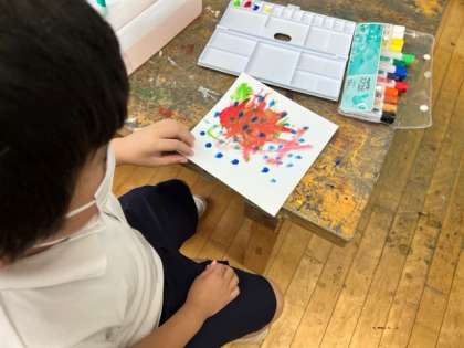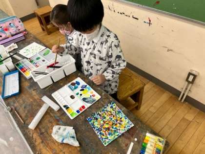 使い始めた自分の絵の具セットで、たくさんの色をつくり、思い思いにぬったり描いたりしています。ちょっとした色の変化にも気づき、楽しく活動しています。
