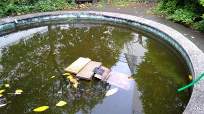 丸池に亀がいます。甲羅干しの際、台に登りやすいよう