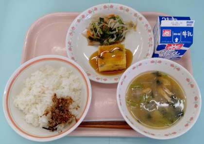 ごはん 骨太ふりかけ 千草卵 甘酢和え じゃがいものみそ汁 牛乳