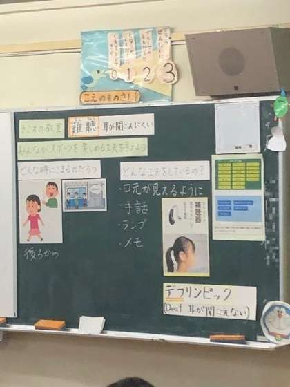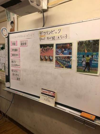 写真の板書にもありますが、耳が不自由な人にとって、どのような時が困るのか、どのような工夫をしているのかを、資料をもとに話し合っていきます。子供たちは耳が不自由な方とのかかわり方だけではなく、お互いが理解し合うことの大切さを学んでいました。最後に耳が不自由な方が行っている運動の世界大会「デプリンピック」について学ぶ機会をもちました。スタート時の「光」による合図等、子供たちはとても興味をもって学習を行っていました。
