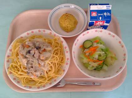 きのこのクリームスパゲティ フレンチサラダ スイートポテト 牛乳