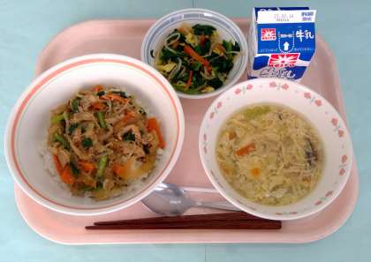 プルコギ丼 ナムル トック入り卵スープ 牛乳