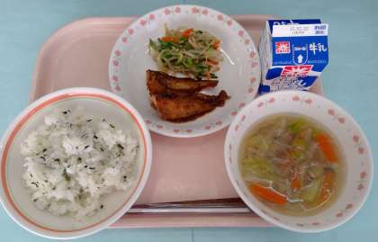 わかめごはん ハタハタのピリ辛揚げ もやしの和え物 春雨スープ 牛乳