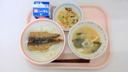 イワシのかば焼き丼、野菜の梅おかか味、みそ汁、牛乳