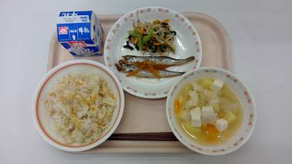 こぎつねごはん、ししゃもの南蛮焼き、おひたし、田舎汁、牛乳