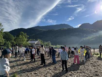 おはようございます。朝は晴天の下、湯の湖で朝会を行いました。