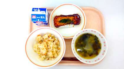 里芋ごはん、お好み焼き風卵焼き、みそ汁、牛乳
