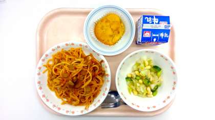 牛乳、スパゲティナポリタン、ビーンズサラダ、りんごマフィン