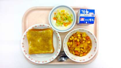牛乳、セサミトースト、ポークビーンズ、フレンチサラダ