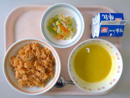 【給食室】チキンライス かぼちゃのポタージュ キャベツのサラダ 牛乳