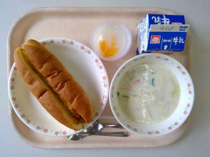 【給食室】カレーミートドッグ 鶏肉と野菜の豆乳スープ カルピスゼリー 牛乳