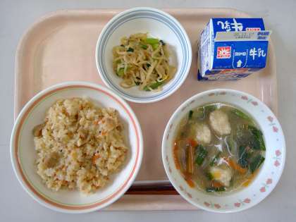 中華おこわ ふんわり団子のにらスープ もやしのナムル 牛乳