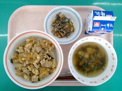 親子丼 もずく汁 大豆とじゃこの揚げ煮 牛乳