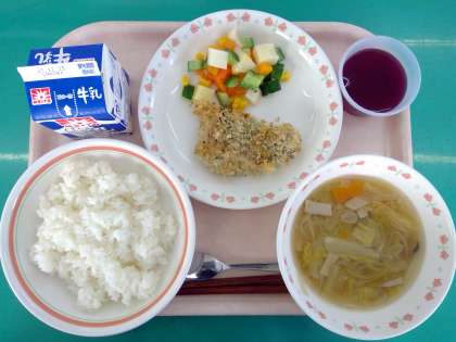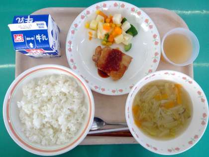 ごはん 鶏肉のハーブ焼き・鶏肉のバーベキューソース 白菜スープ マセドアンサラダ グレープゼリー・ピーチゼリー 牛乳