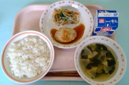 ごはん 鶏ごぼうバーグ もやしとわかめの甘酢和え 豆腐のすまし汁 牛乳