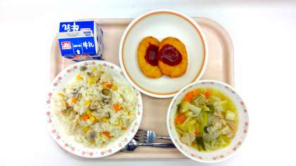牛乳、きのこピラフ、豆腐のナゲット、田舎風豆スープ