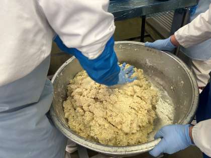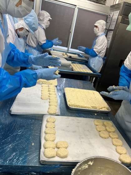 今日は、鶏ひき肉と豆腐を使って作ったナゲットです。具材を練るのは2人がかりで、半分ずつ行いました。3年生が社会科見学で不在のためいつもより少ない食数でしたが、ひとり2こずつ食べられるように作ったので、結局は大忙しな日でした。今日は全部で950個のナゲットを作りました。