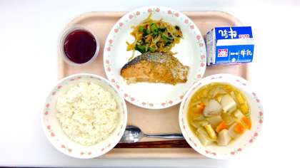 牛乳、ごはん、魚の七味焼き、野菜のからしじょうゆあえ、呉汁、グレープゼリー