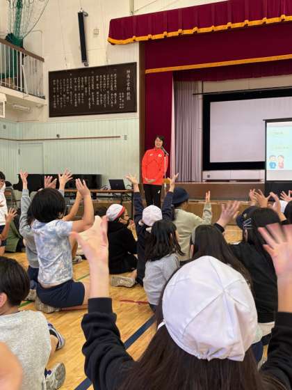デフリンピックの選手の方と出会うとさっそく手話であいさつをする児童もいました。