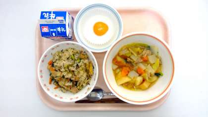 牛乳、ひじきとすき昆布のおこわ、東京都産野菜と豚肉のうま煮、おかしな目玉焼き