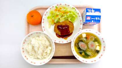 ごはん、おみくじコロッケ、ボイル野菜、みそ汁、青島みかん、牛乳