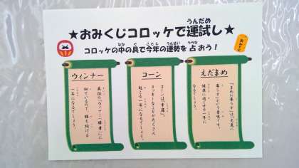 今日は、コロッケの中の具で今年の運勢を占う「おみくじコロッケ」を提供しました。ウィンナー、コーン、えだまめの3種類です。みなさん中身は何が入っているかワクワクしながらコロッケを割っていました。