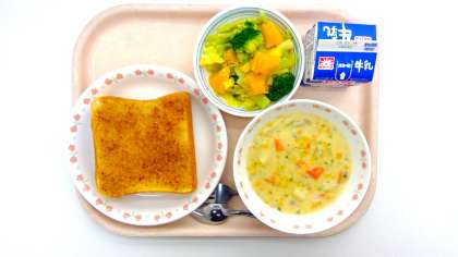 メープルシロップトースト、サーモンチャウダー、ネーブルオレンジのサラダ、牛乳
