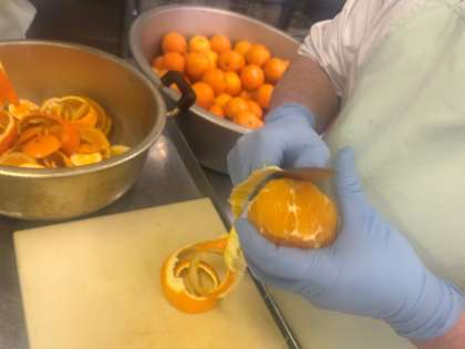 ネーブルオレンジの「ネーブル」とは、英語で「へそ」という意味です。ネーブルオレンジにはおへそのようなでっぱりがあるため、この名前がつきました。今日は、ネーブルオレンジを一口大にカットしてサラダに混ぜ込みました。ドレッシングには東京産のフルーツレモンを絞り、皮も千切りにして使用しました。さわやかな風味のサラダです。