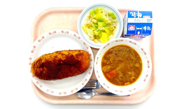 牛乳、ココアあげパン、ハッシュドポーク、ビーンズサラダ
