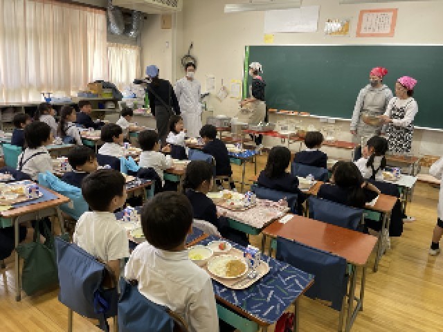 1年生の給食が始まりました。ひまわりーずの皆さんに手伝ってもらい、配膳もスムーズに行うことができました。みんなでおいしいカレーライスをいただき、笑顔あふれる給食の時間となりました。
