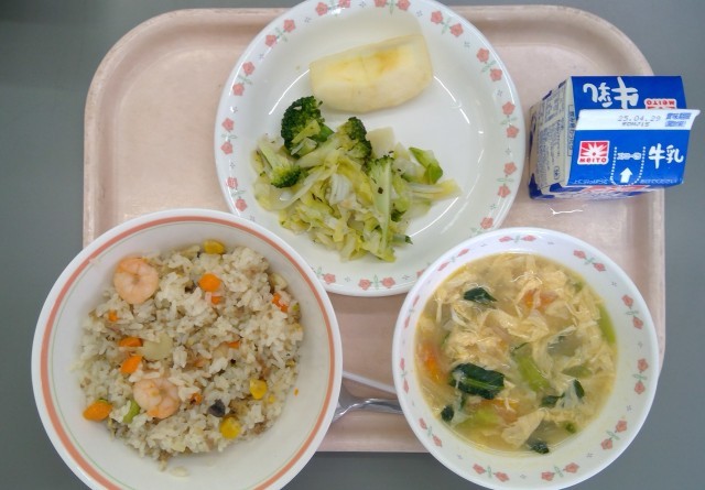 シーフードピラフ グリーンサラダ 卵とチーズのふわふわスープ りんご 牛乳